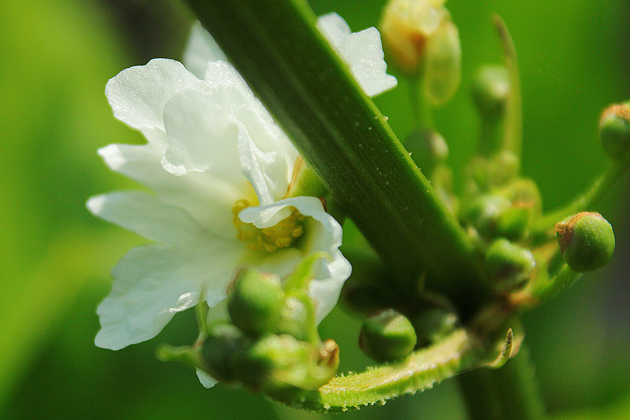 大部分的花卉面積不大,例如這朵黃花亦是如此,若是花群可觀,可直接拍攝花田,若單拍花卉以更近距離補抓特寫為佳,此時可將過多的背景裁切後,獲得更近距離的細節可供欣賞,並且畫面下方的花苞亦更明顯與花開成對比。(建宏作品)