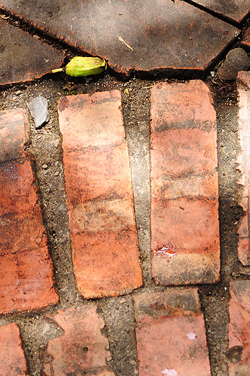 這張佳作隱隱展現出幾何的佈局,不知名的果子掉在線條的集中點,裂縫是線條,長形磚頭的色塊亦屬短線條,線條有利引導視覺,果子本身為點的元素,因此這張相片可立即性引導觀賞者的視覺集中至果子上,畫面下方由許多磚頭形成的色塊構成,具備秩序感。(明璟作品)