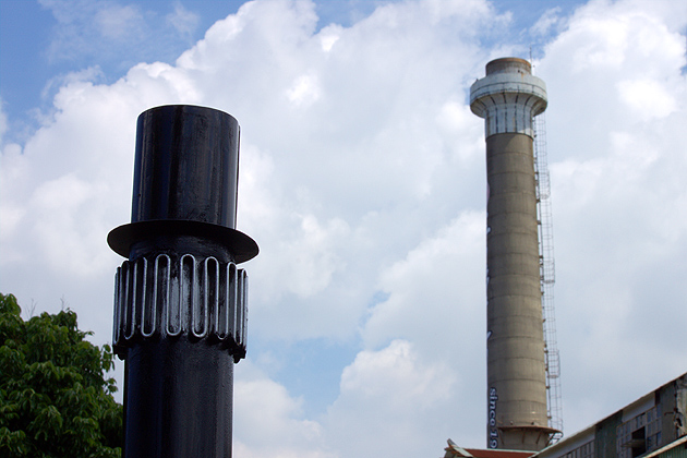 這張佳作採外觀對比構圖,近景為現場裝置藝術的煙囪,遠景為工廠煙囪,一前一後,一長一短,顏色一深一淺,是好的對比構成。(瑋婷作品)