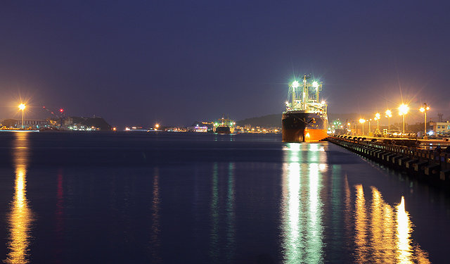 拍攝夜景的黃金時間是猶存色溫的時間,此時天空因呈現寶藍色而非常討喜,加上遠方的輪船及燈火倒影,就是一張很棒的港口夜景作品。(文慶作品)