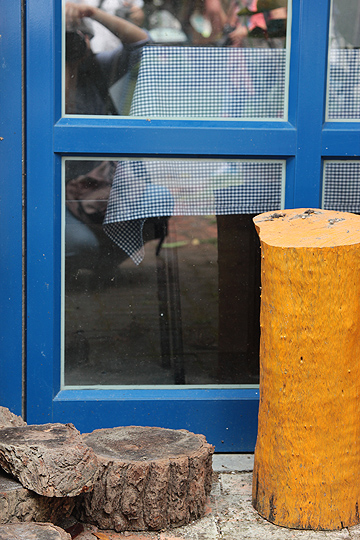 這張佳作一開始容易以醒目討喜的藍黃純色吸引目光,繼而細心欣賞後會發現作者安排二種形態的樹幹作為對比呈現,且從展示面的邊緣線與門寬的垂直線等距,構圖精準。(淑華作品)