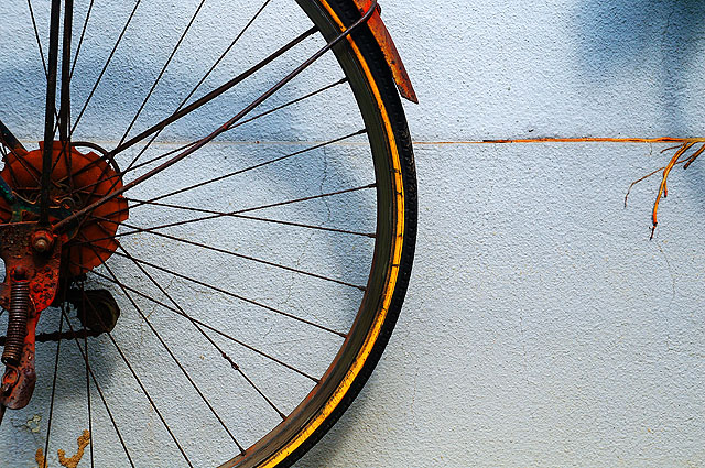 若要產生強大的視覺力道,主題面積的安排佔了很大因素,當您以更近距離捕捉最具特色的局部時,容易獲得這樣的效果,以這張作品而言,只拍攝車輪局部,不僅可獲得更大面積及更多細節的表現,更能表現出單一形狀圓的特性,若改拍整台腳踏車入鏡則容易力道盡失。(玉庭作品)