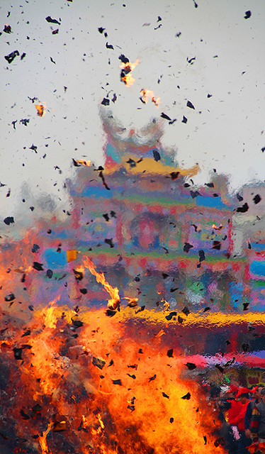 這張佳作的拍攝方式很特別,燒金紙因溫度高,導致空氣產生熱擾流,透過這樣的空氣拍出去的景象便能呈現一種特殊的抽象感,遠方的廟宇搭配前景的漫天金紙,氣氛十足,手法創新! (裕盛作品)