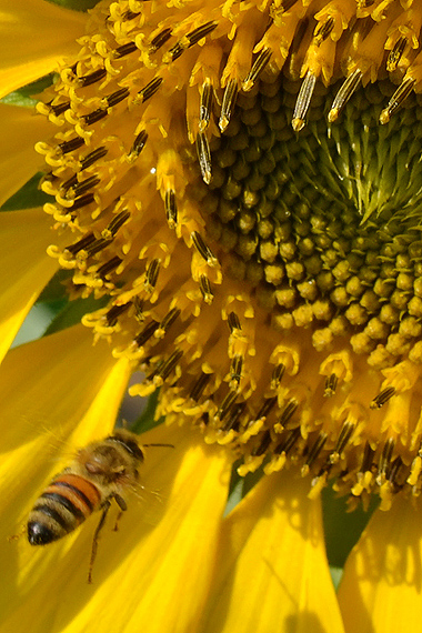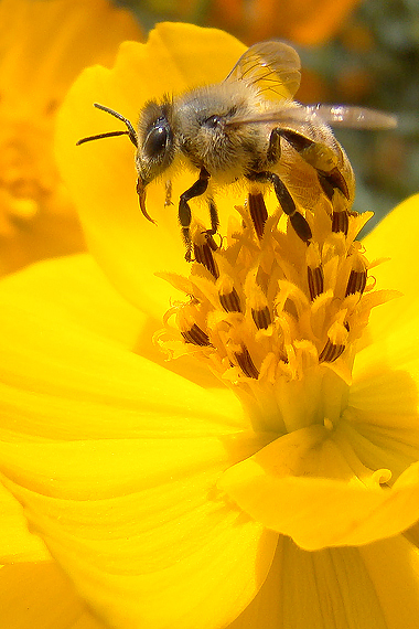 這張亦是帶著蜜蜂入鏡的佳作,我們外出攝影時,有時手邊缺乏望遠鏡頭,所幸現在的相機均為高畫素,事後進行二次裁切除了有效精鍊畫面之外,更能拉近局部展現細節,即使是廣角鏡有時也能變成望遠鏡。這張佳作除了細節豐富、蜜蜂與花卉的討喜元素外,整張作品為黃色單色調的呈現。(莉珍作品)