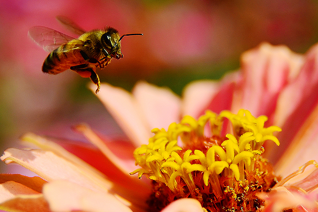花卉中若希望昆蟲入鏡,比較好的方法是採用守株待兔的方式,先對好焦購好圖,靜待昆蟲入鏡後以高速快門加上連拍的方式,可提高不少成功率,惟景深可使用較小光圈以避免花卉搖曳或昆蟲飛出景深範圍外導致主體模糊。(如濱作品)