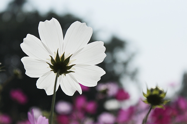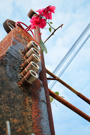 這張作品除了展現嬌柔花朵與堅實金屬的對比之外,也展現作者以有別於自身高度的視角取景的嘗試,為了提高視覺陌生感,採用低角度拍攝往往可獲得不錯成效。另外儘量避免背景出現電線,這是因為電線、電線桿容易破壞畫面,形成強大干擾。(虹頤作品)