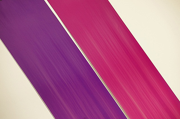 這張佳作運用俐落、毫不猶豫的果斷斜線劃過整個畫面,二道主線條互為紫色與桃紅,屬鄰近色的搭配運用,線條之中隱含更細微的線條細節。(子芸作品)