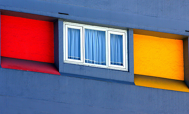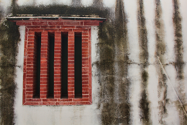 這張佳作以左邊的矩形作為表現主體,面積雖為矩形,仔細一看卻由許許多多的垂直與水平短線構成,紅黑顏色鮮明,黑紅色垂直線條,搭配牆面上的灰白垂直水痕線條,形成二種巧妙的對比。由於這張相片使用廣角鏡,因此窗戶的垂直線條有稍微變形。若能改採標準或望遠鏡,並正面拍攝,相信構圖可更精準。(明峰作品)