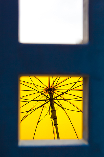 這張作品採用框景與對比二種構圖,主角的傘為黃色,透過藍色的框來框景與產生顏色對比,而下方的滿框與上方的空框亦形成有與無的對比,十分難得的複合式構圖。(景倡作品)