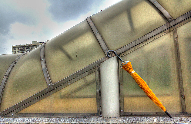 這張佳作選擇一個背後具備複合線條的背景,將傘以斜放方式產生斜線,並採用影像後製來詮釋畫面,傘的黃色在整體黃色系為主的色調中亦能成功突顯出來,不被鄰近黃色調搶走力道,可謂不易,是張成功展現複合線條與色彩表現的佳作。(福星作品)