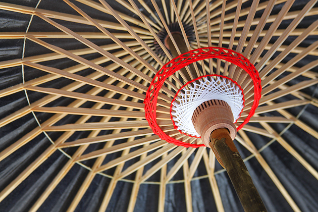 在芳玉的”話傘”系列中,陳述的是一把傘每個製程的畫面,其中我特別挑選這張以傘架為主的作品供大家欣賞,主因是一般畫面中若充斥過多的線條時,畫面容易被線條切割後產生雜亂感,但人們喜歡看規律、秩序感的事物,因此這張佳作線條雖多,構圖卻安排妥當,並無雜亂感,反而呈現出一種精湛手工藝下才能呈現出的嚴謹、精確、秩序。此外整張畫面為三色調,深藍、淺黃、中紅,正是三原色。(芳玉作品)