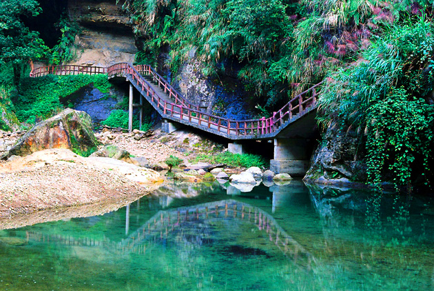 這張拍攝於杉林溪的一處曲橋倒影,潭面如鏡,無風無紋,倒影非常清晰,因此適合用對稱式構圖拍攝。