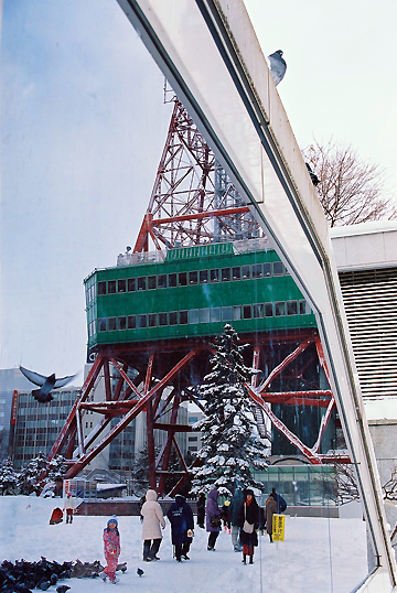 這是一張很有趣味性的相片,拍攝於北海道札幌大通公園,畫面中是地下鐵入口旁的玻璃,透過玻璃反射出對面的實景,畫面中的小女孩眼睛注視著飛起的鴿子,而鴿子正朝向實體停駐在入口建築物上的鴿子處飛去,好像要從倒影中飛出來一樣,這二條無形動線又恰巧跟入口建築物的實體線條成為虛實對比。