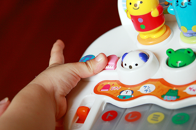 這是宣樺喜歡的電子小鋼琴,可以發出鋼琴聲音,也可以發出一些動物的叫聲,拍攝小朋友玩玩具的過程也是很棒的紀錄。